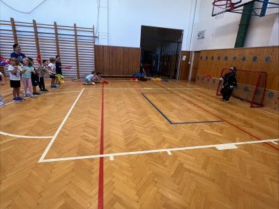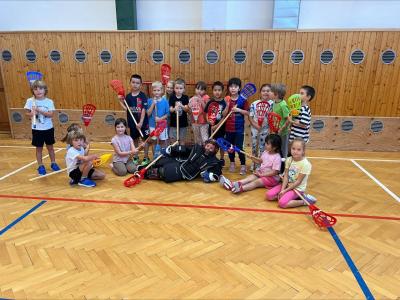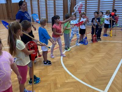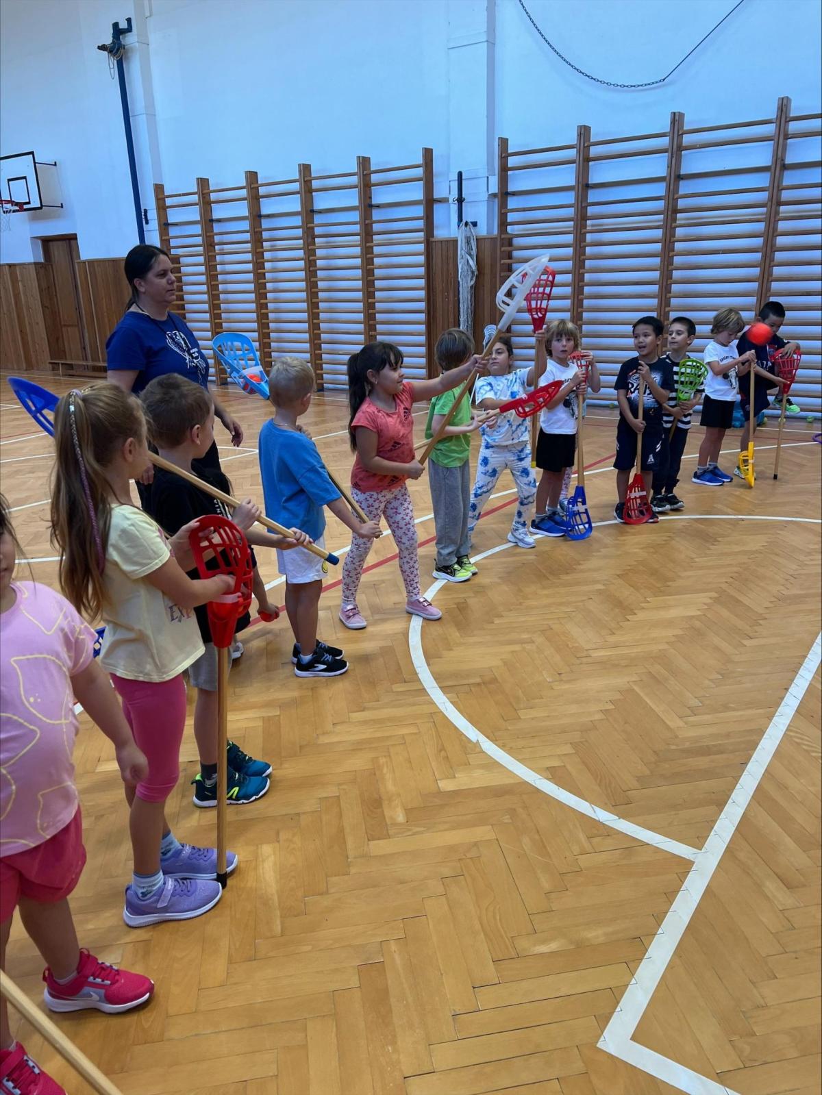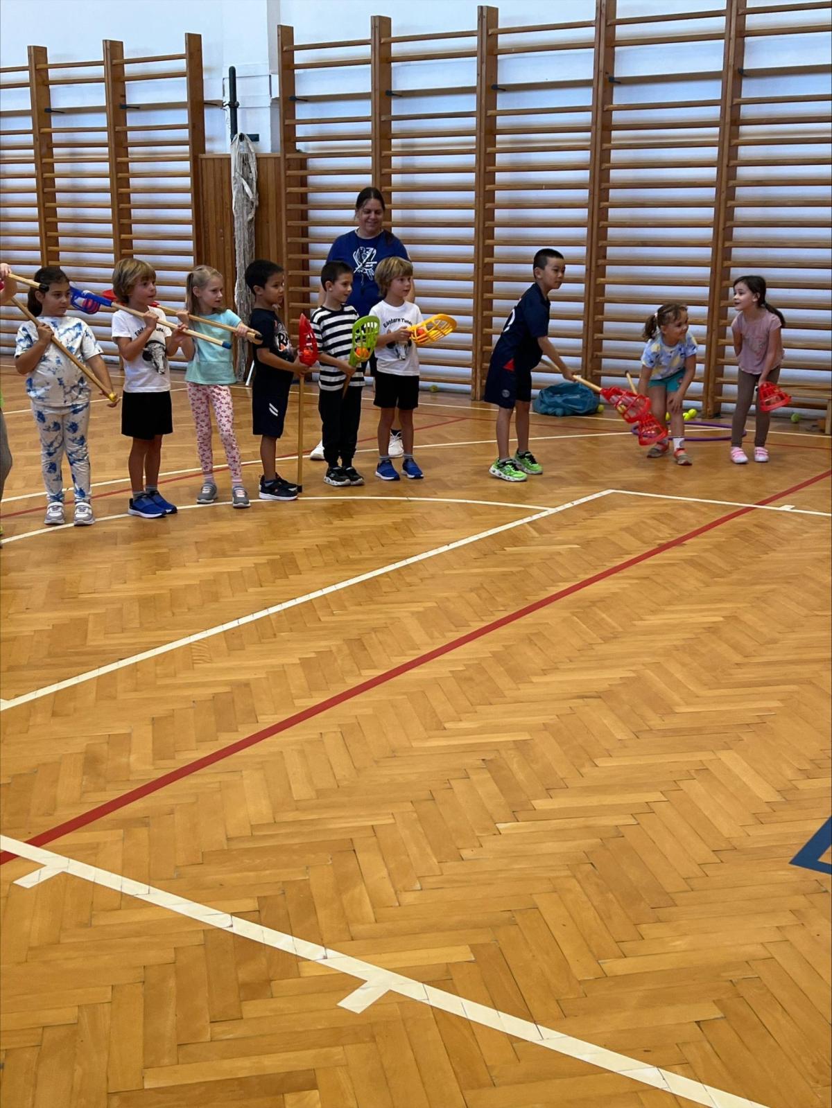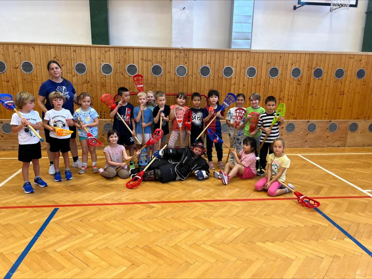Děti si užily i ukázkovou hodinu tělesné výchovy, kde si vyzkoušely základy sportu lacrosse – házení a chytání míčku i jednoduché hry.