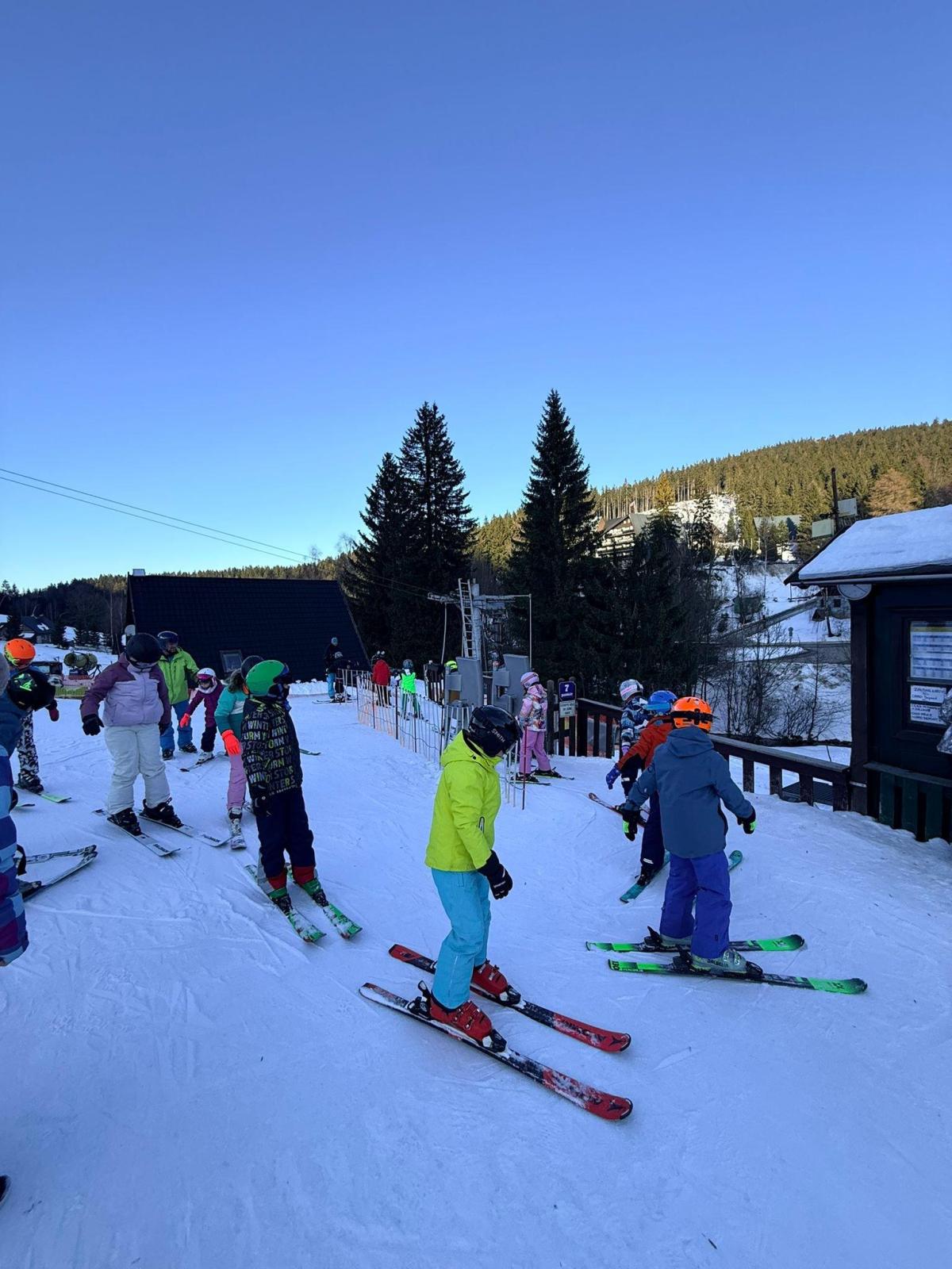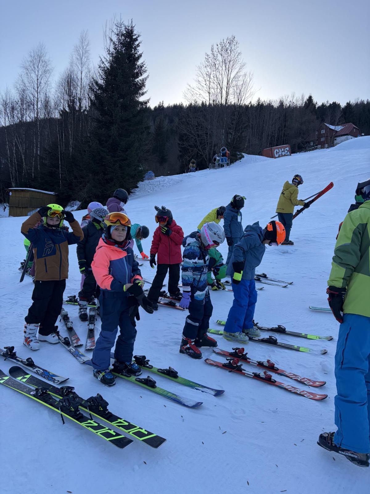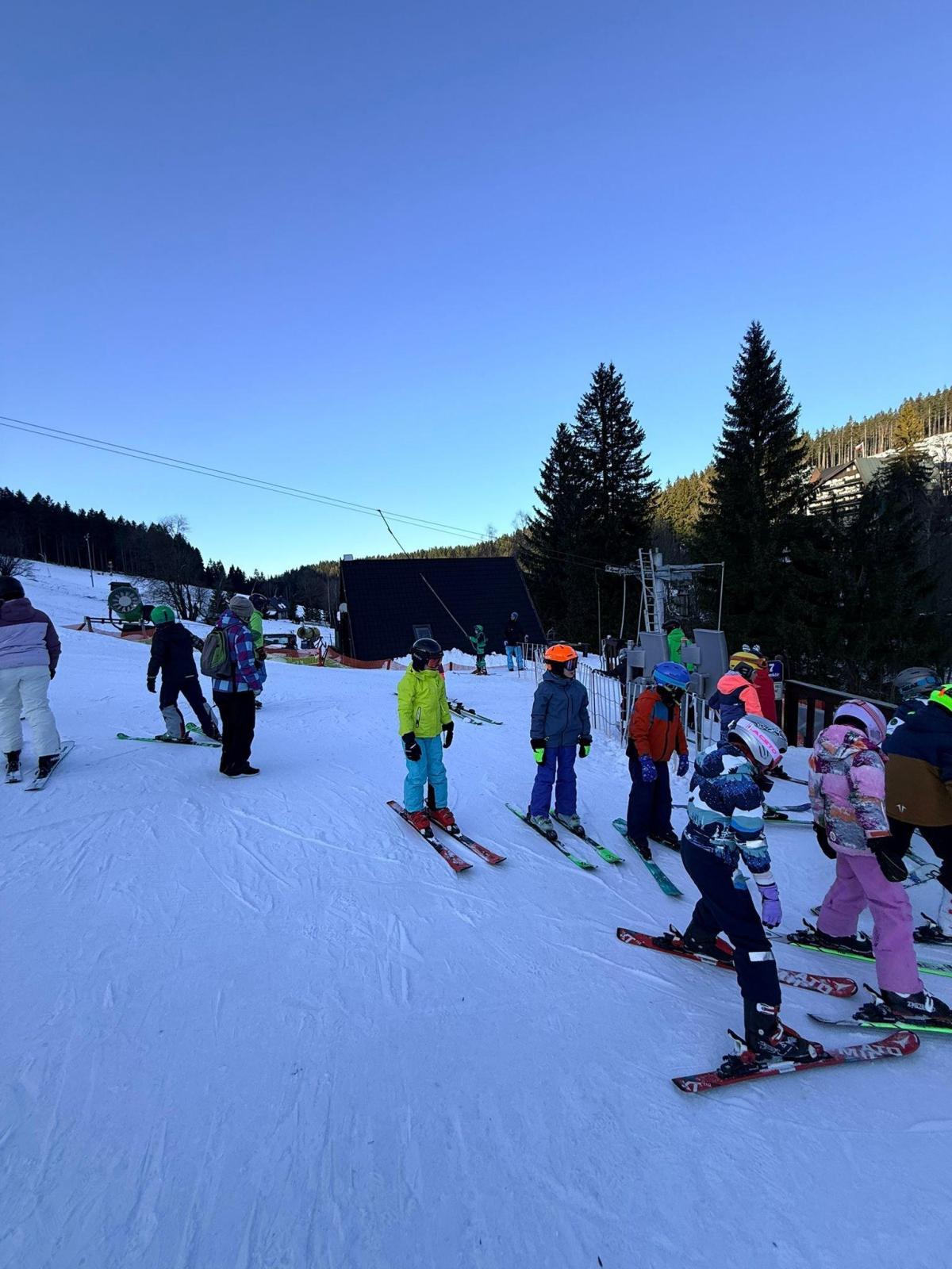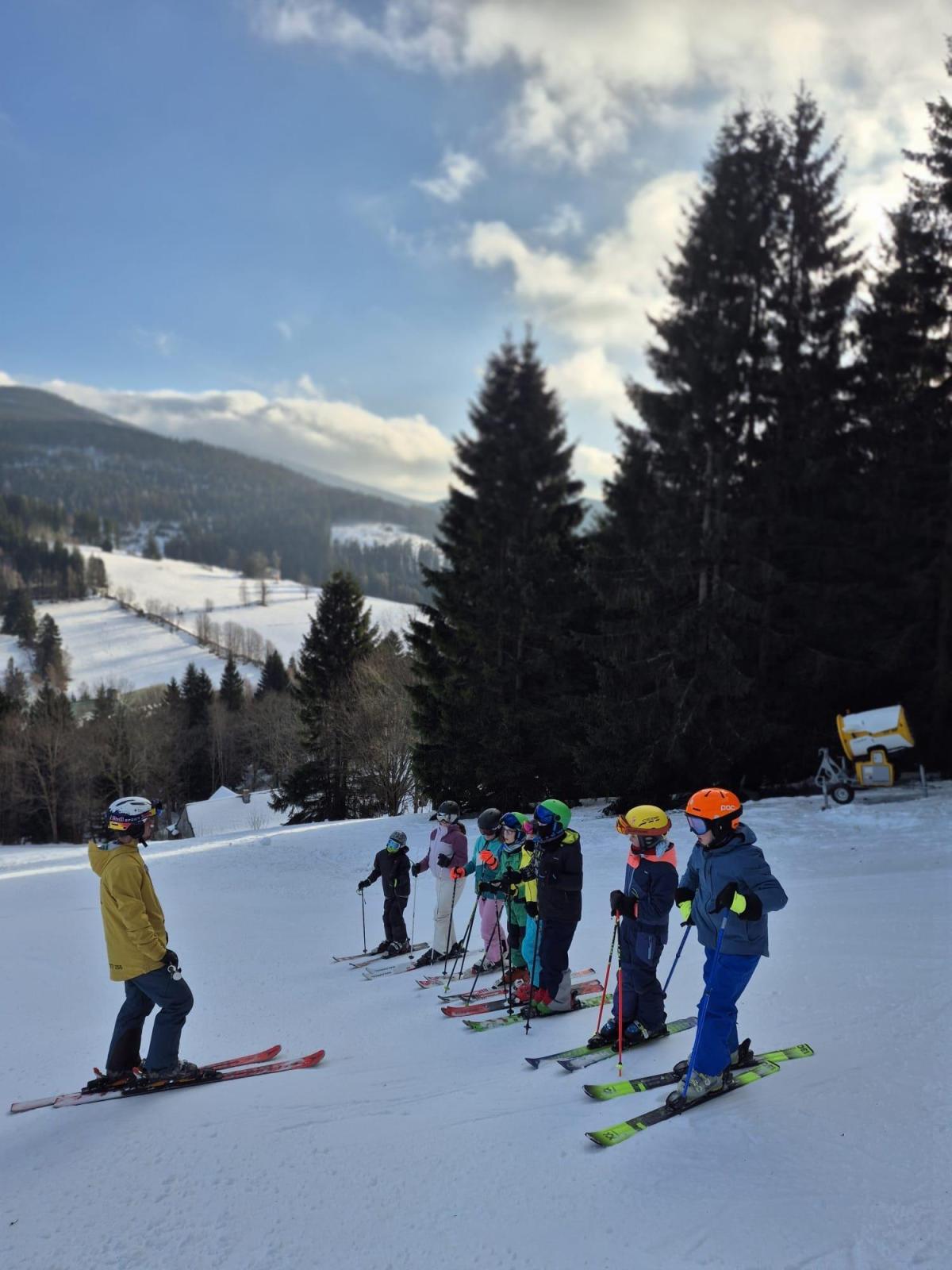 První den lyžování máme zdárně za sebou.. Dojeli jsme v pořádku, ubytovali jsme se, najedli a vyrazili ven. První lyžování jsme všichni statečně zvládli, začátečníci trénovali na mírném kopečku a pohyblivém koberci a ostatní na sjezdovce a vleku u hotelu pod dohledem instruktorů. Počasí bylo v pořádku, jsjezdovka byla místy zledovatělá, ale všichni se s tím poprali výborně. Zítra nás čeká lyžování dopoledne i odpoledne a po večeři budeme psát dopisy.