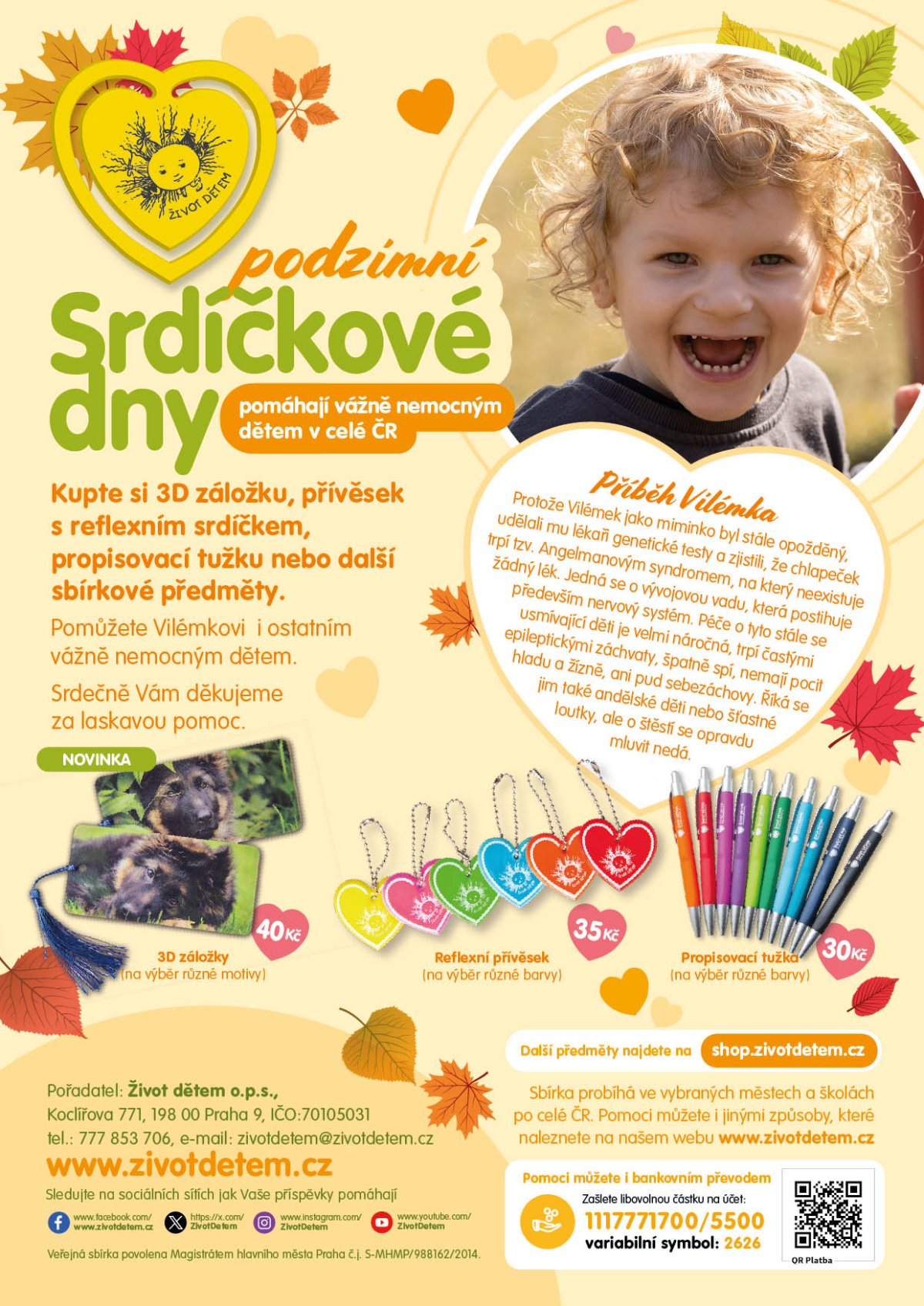 Zakoupením drobných předmětů – například reflexního přívěsku ve tvaru srdíčka, 3D záložky nebo propisky – můžete i Vy podpořit nemocné děti a jejich rodiny.