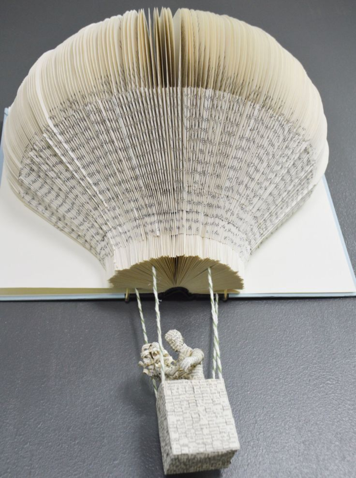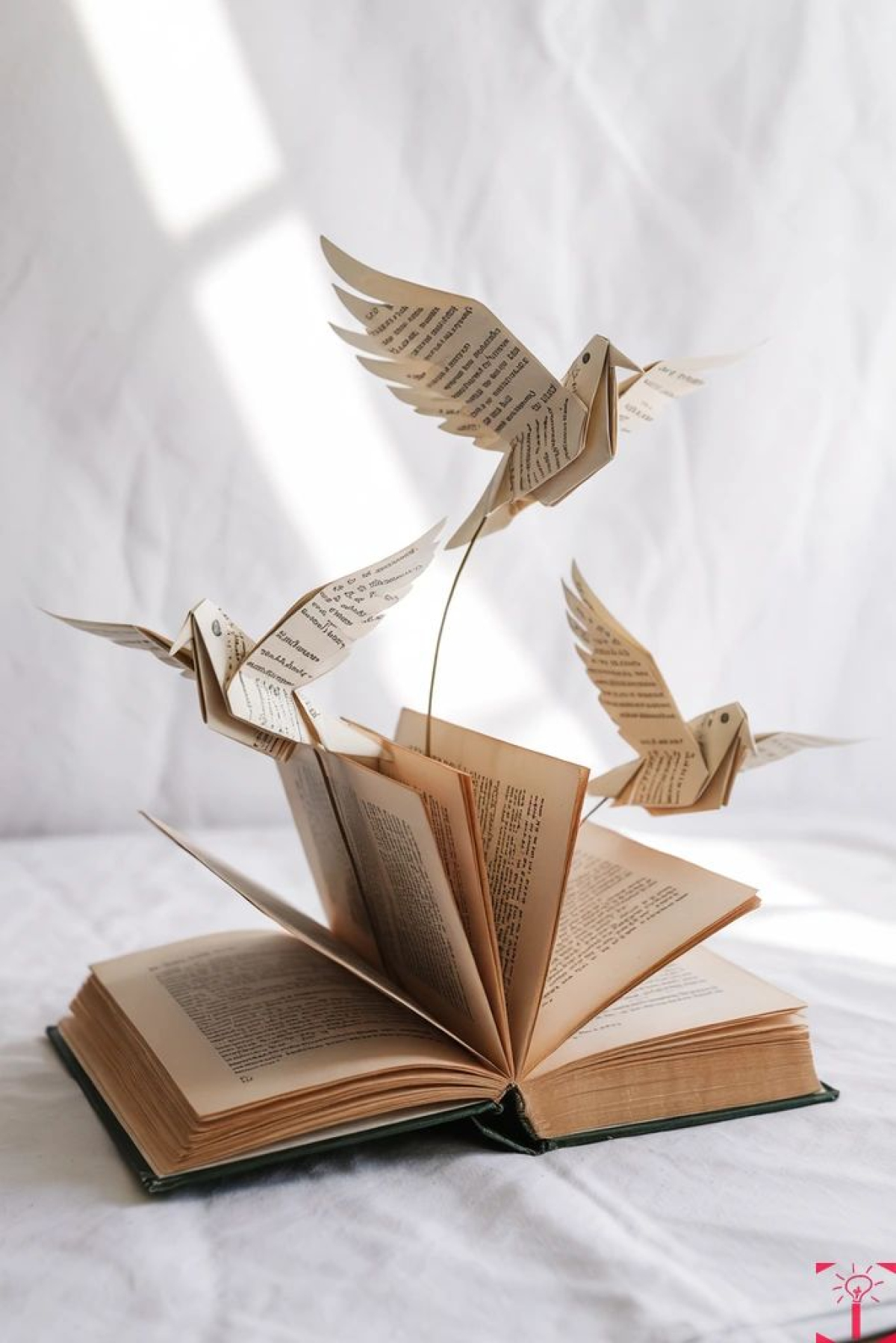 - Fantasy: Ze stránek jsou poskládané vlaštovky nebo draci, kteří na tenkých drátcích "vylétají" z rozevřeného středu knihy.