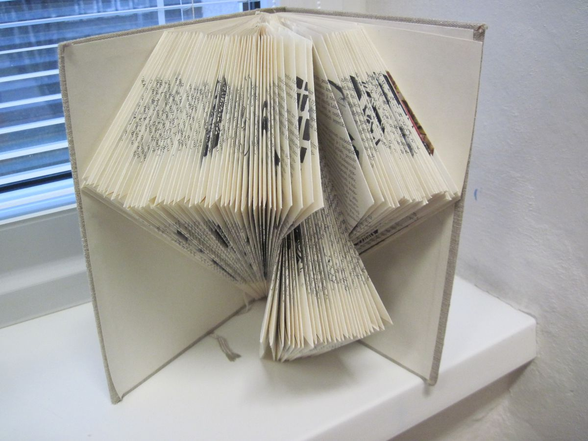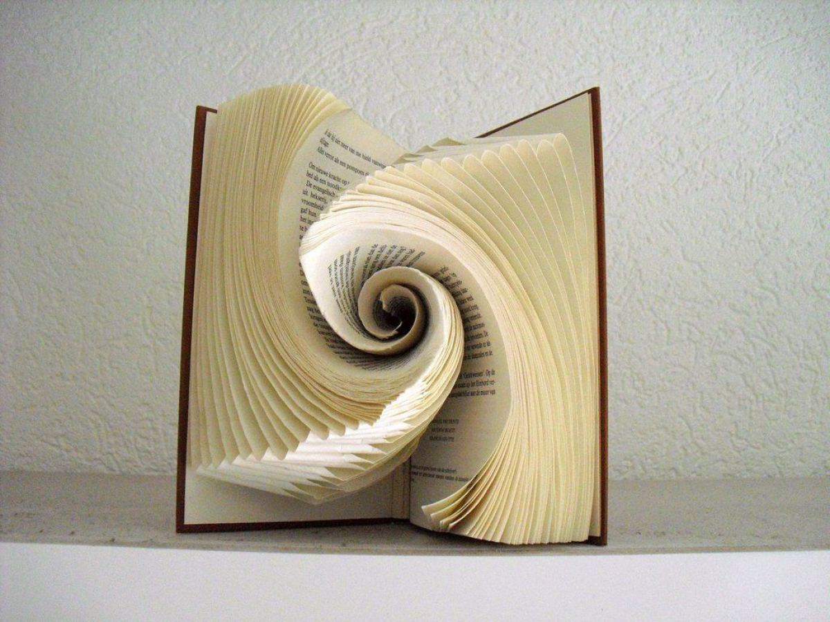 - Skládání a origami: Ohýbání stránek tak, aby z rozevřené knihy vystupoval objekt (hory, obličej, abstraktní tvar).